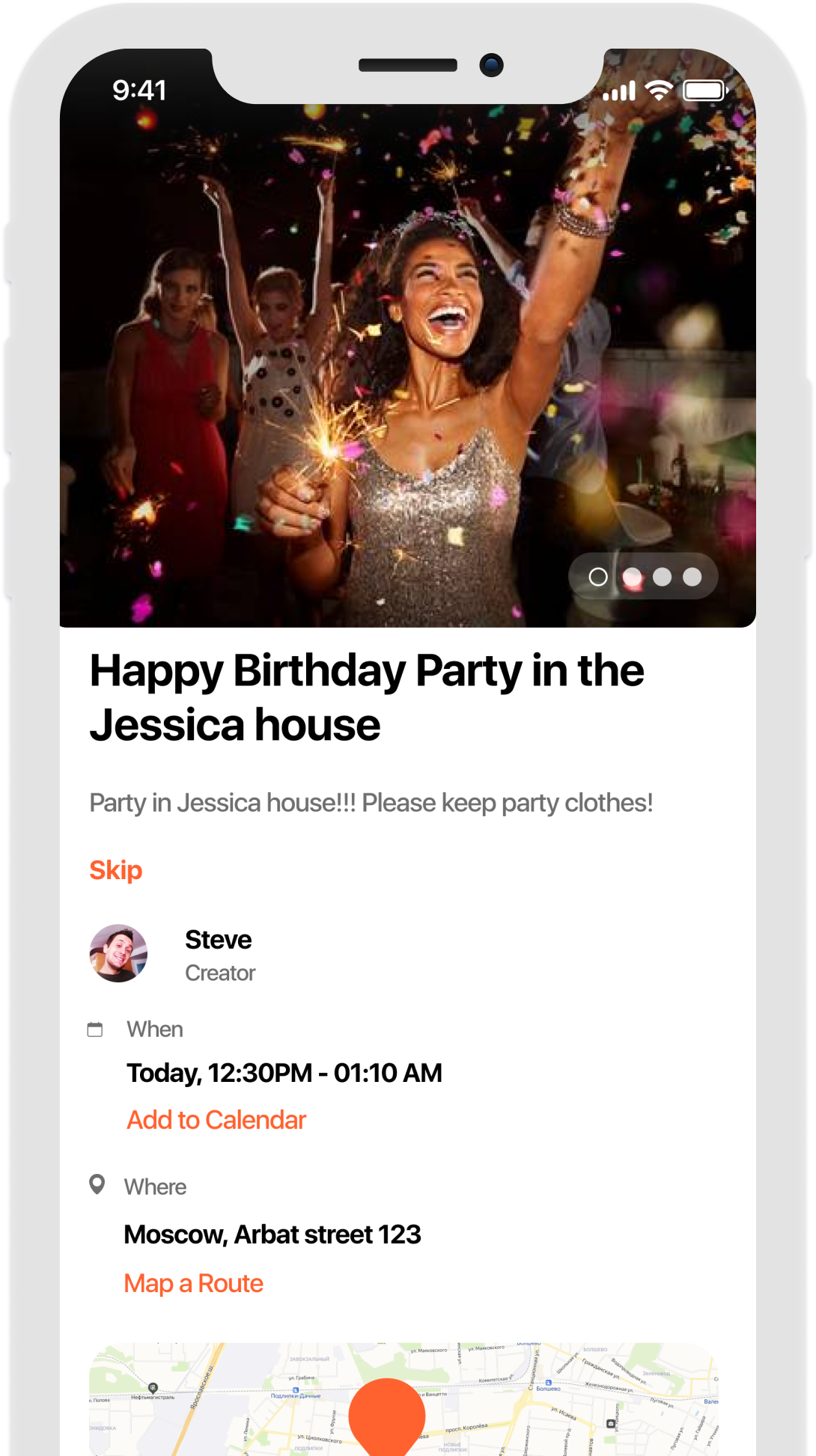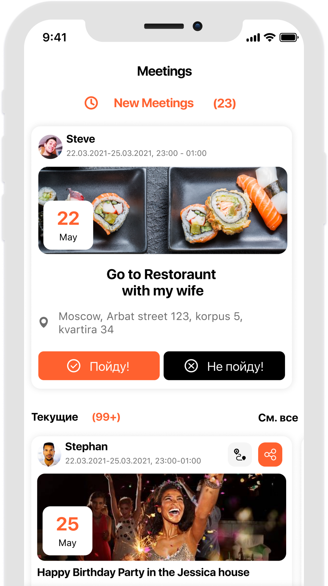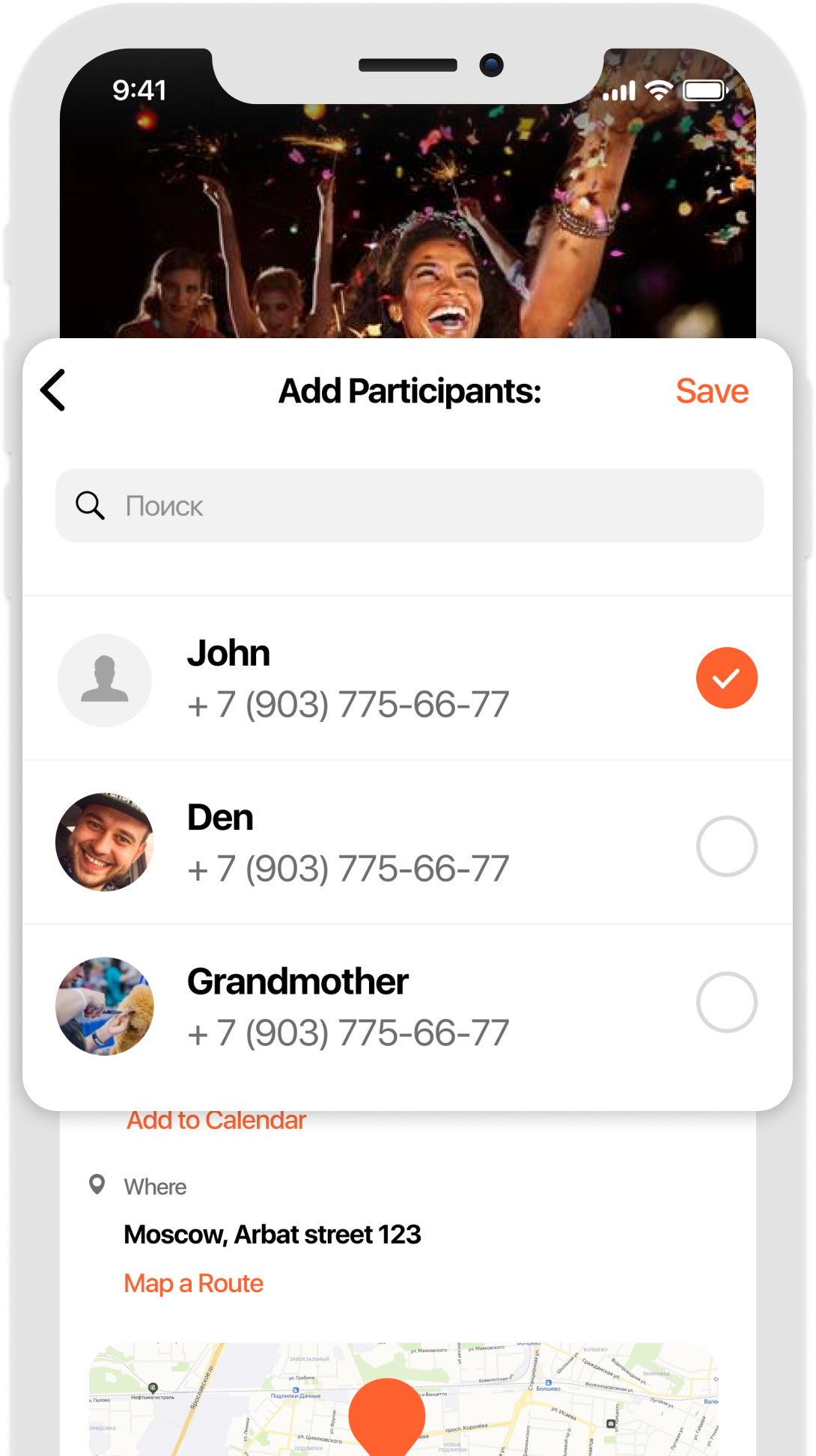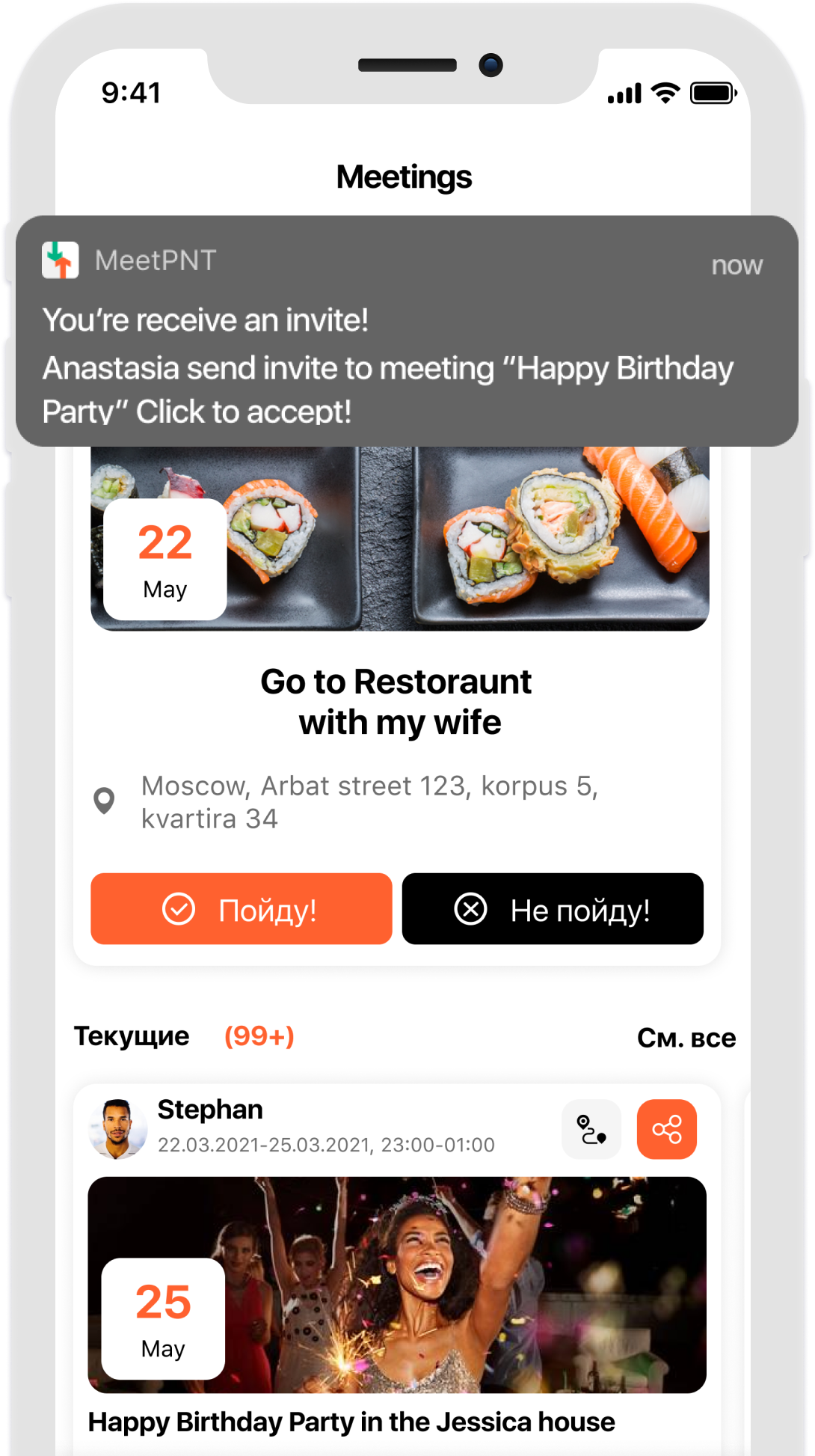 - Sends an invitation. - Reminds you at the right time. - Shows on the map. - Alerts about changes. - Finds a route.